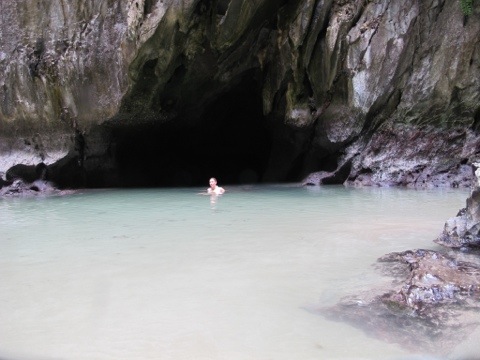 Also ging’s um 9 Uhr morgens los. An der Höhle angekommen, muss man durch einen schmalen Eingang ins Dunkle schwimmen. Der Tunnel ist ca. 80 m lang und leicht gebogen, so dass man in der Mitte weder Ein- noch Ausgang sieht. Ein bisschen gruselig und spannend. Mit Taschenlampe und Kamera bewaffnet, ging’s immer weiter durch den Tunnel – bis es plötzlich immer heller wird und das Tageslicht eine innere Lagune preisgibt. Hier haben Piraten ihre Schätze versteckt. Ein wirklich zauberhafter Ort. In der Mittagszeit fällt die Sonne senkrecht in die Lagune und die Reflektionen des Wassers spiegeln sich im Höhleneingang und erhellen einen Teil des Tunnels. Und in diesem Moment des Bewunderns, kommen die Massen – also schnell wieder raus 🙂