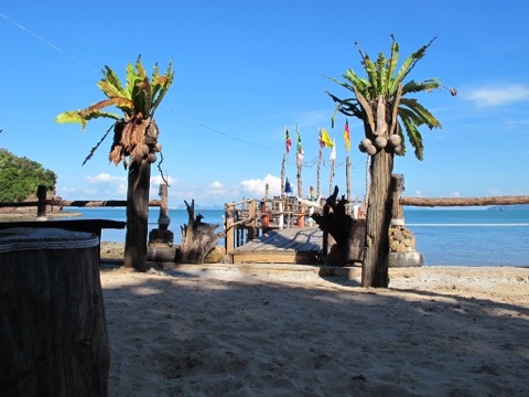 Kaum angekommen, mieten wir uns sofort einen Roller, um die Insel zu erkunden. Bis zum südlichsten Punkt sind es aber nur 20 Min Fahrtzeit. Wenn es auf diesem Planeten noch so etwas, wie einen Aussteiger-Hippie-Ort gibt, dann haben wir diesen heute gefunden. Eine etwas abseits gelegene, traumhaft schöne Anlage… sehr liebevoll gestaltet, mit Baumhäusern, zu Bugalows umgebaute Boote – alles perfekt. …fast alles, denn der Strand war ein wenig felsig und daher war dies nicht unser „Place to be“ – denn Schnorcheln und Schwimmen lies sich an diesem Strand nicht vereinen.