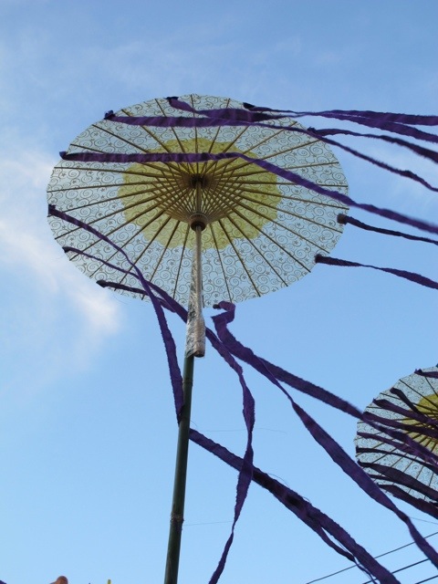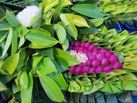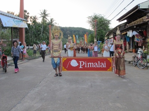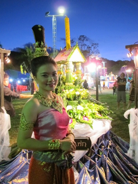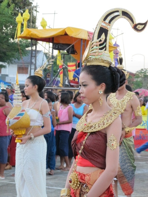 Die Parade zu Loi Krathong stand schon in den Startlöchern.. Also schnell den Roller geparkt und uns auf die Suche nach einem Loi Krathong Schiffchen gemacht. Diese kleinen runden Flößchen bestehen aus einer Scheibe Bambusrohr um das aufwendig gefaltete Bananenblätter befestigt werden. Dann werden sie mit Blumen geschmückt und erhalten noch eine Kerze und Räucherstäbchen. Die Seenomaden befestigen auch noch Haare, Fingernägel und ein Stück ihrer Kleidung auf dem Boot um dieses dann brennend auf das Meer zu schicken. Diese Tradition soll das Unglück forttragen. Was im Laden der freundlichen Thailänderin sofort auffiel wie freundlich und aufgeschlossen die Menschen auf Lanta sind. Besonders die Kinder scheinen sich wie magisch von Ausländern angezogen zu fühlen. Man fällt aber auch in Old Town auf, da die Ostseite der Insel nicht touristisch ist. Somit mal wieder Glück gehabt, gerade so ein trationelles Fest mit Einheimischen feiern zu dürfen. Also ging’s nun los mit dem bunten Umzug.