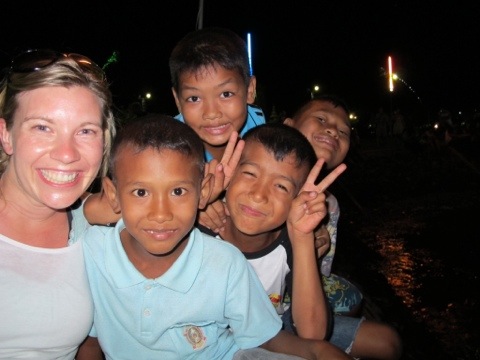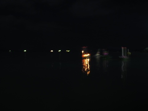 Der Umzug endete auf dem Marktplatz wo es viele kleine Garküchen und allerlei Krimskrams gab. Die Touristen überwiegend Franzosen und Skandinavier mischten sich unters Volk und wir haben uns von Bude zu Bude durchgefuttert. Als wir am Pier saßen wurden wir mit einem mal von ein paar kleinen Jungs umzingelt die sich einfach neben uns setzten und einer mir wie selbstverständlich sein Feuerwerk anzündete (kleine Kinder Feuerwerke ähnlich wie Wunderkerzen) und sie mir einfach in die Hand drückte und sich dann mit einem anderen Jungen um den Platz neben mir gestritten hat 🙂 auf die Frage dschüarai (wie heißt du) grinsten sie über beide Ohren und verrieten mir ihre Namen: Mao, Abdung, Gong und Abdin haben uns eine kleine Stunde Thaiunterricht gegeben und uns mit Händen und Füßen diverse Tiere auf Thai beigebracht.
