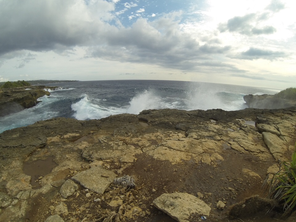 Eine Rollertour – so der Plan für die langsam aufkeimende Langeweile nach einem Vormittag auf der Strandliege. Eine rollender Gefährte wär schnell an der Rezeption ausgeliehen und schon ging es los. Die Straßenverhältnisse ließen etwas zu wünschen übrig, davon haben wir uns aber nicht abschrecken lassen. Erster Stop an der bezaubernden Aussicht für ein schnelles Foto und einen der leckersten Smoothies mit Apple Cinamon Brownie. Zweiter etwas unfreiwilliger Stop nach dem Teil der Insel, den man als Tourist lieber nicht so sehen möchte (Müll an jeder Ecke), ein Platten! Zum Glück war das Dorf nicht weit und die Einwohner überaus freundlich und hilfsbereit. Dieser Teil der Insel baut Algen an und diese werden dann in der Sonne getrocknet und gemahlen in alle Welt verkauft. Nach 5 Minuten war der technische Defekt behoben und es konnte weiter Richtung einer Felseinbuchtung in der die Gischt meterhoch den Felsen hinaufsteigt. Ein mehr als beeindruckendes Naturschauspiel.