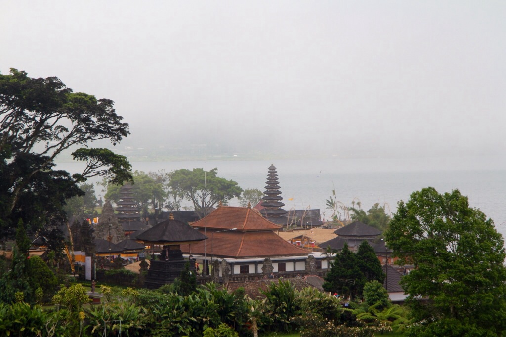 Unser erstes Ziel „Pura Ulun Danu Bratan“ ist ein Tempel, der im Vulkansee liegt. Dieser gilt als eines der meißt-fotografiertesten Sehenswürdigkeiten Balis. Da an diesem Tag eine große Prozession stattfand, bot sich der Blick leider nicht ganz idyllisch, wie gedacht. Eine große Bühne und zahlreiche hinduistische Pilger.