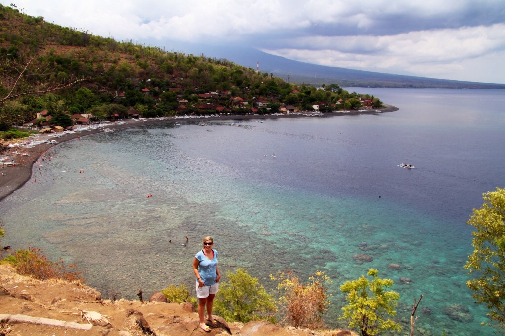 Weiter ging es Richtung Nordküste immer wieder vorbei an winkenden Kindern, die Hello rufen und sich freuen, wenn man das Winken erwidert. Der Norden ist wenig touristisch und wirkt sehr authentisch. Wir bogen Richtung Westen ab und haben im kleinen Ort Kubu einen Zwischenstop mit Übernachtung eingelegt. Hier reihen sich Tauchschule an Tauchschule. Vor der Küste befindet sich ein Wrack eines gesunkenen US-Kriegsschiffes, dass Taucher aus aller Welt anlockt. Gut ausgeschlafen verbrachten wir noch ein Stündchen mit relaxen am Pool, bevor es weiter um den Vulkan herum, an der Küste entlang ging. Hier haben die Strände schwarzem Sand und locken mit schönen Schnorchelplätzen. Schaut man von oben in eine Bucht kommt man sich vor, als würde man ein Wimmelbild anschauen. Lauter Touristen die bäuchlings-schnorchelnd im Wasser treiben.