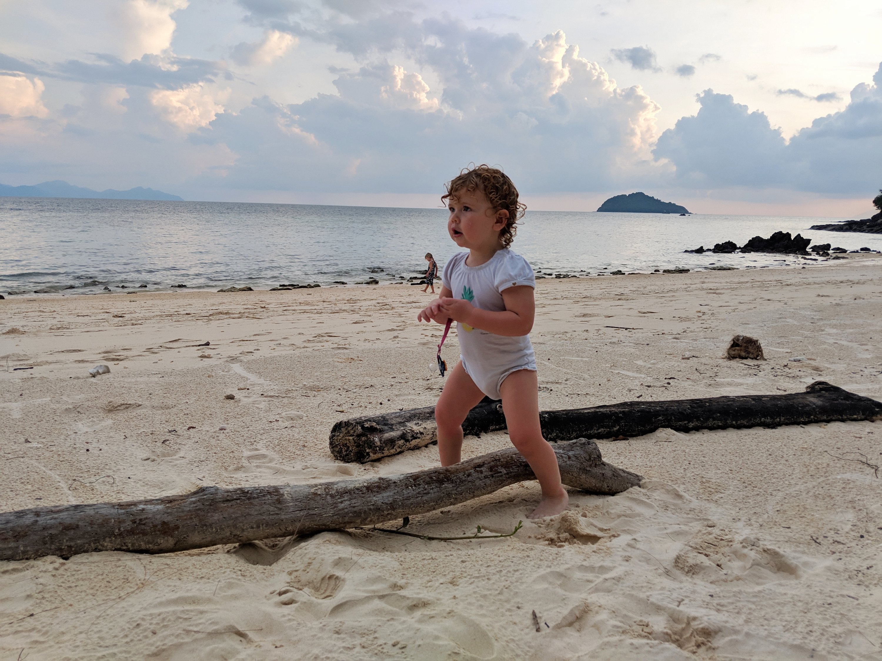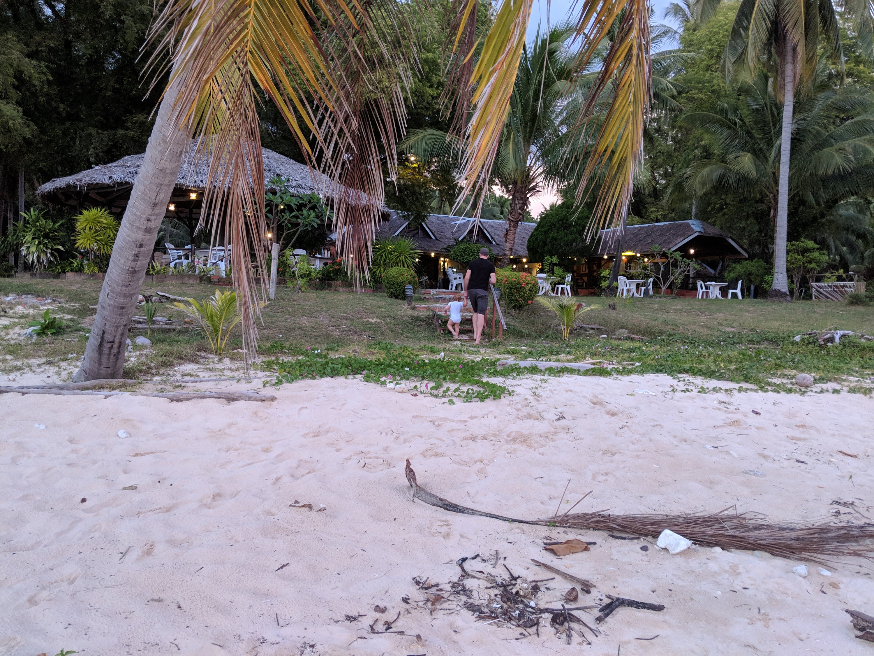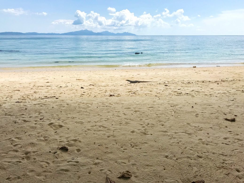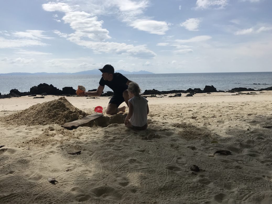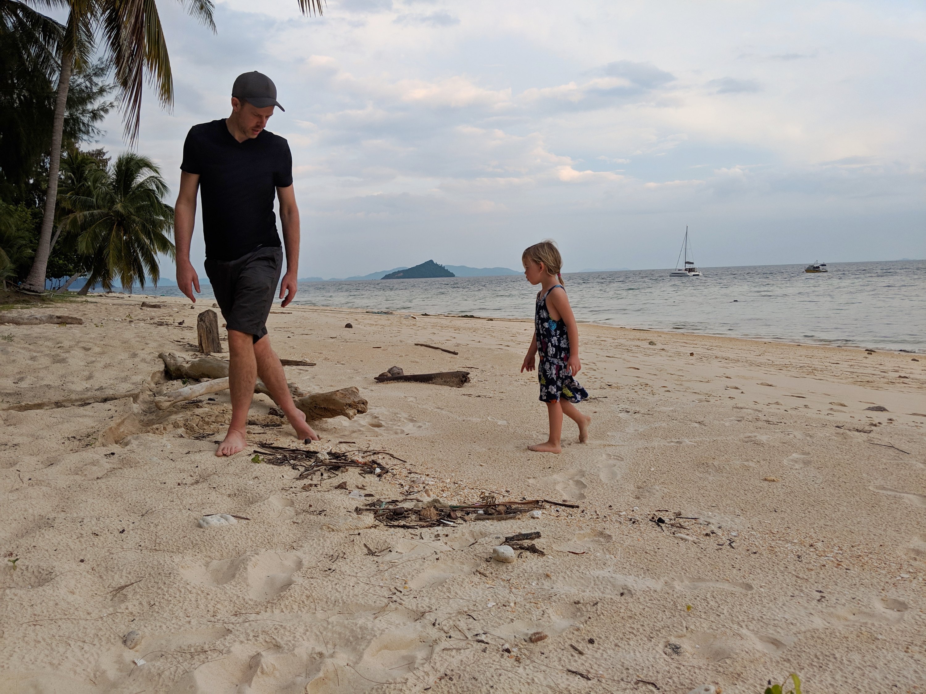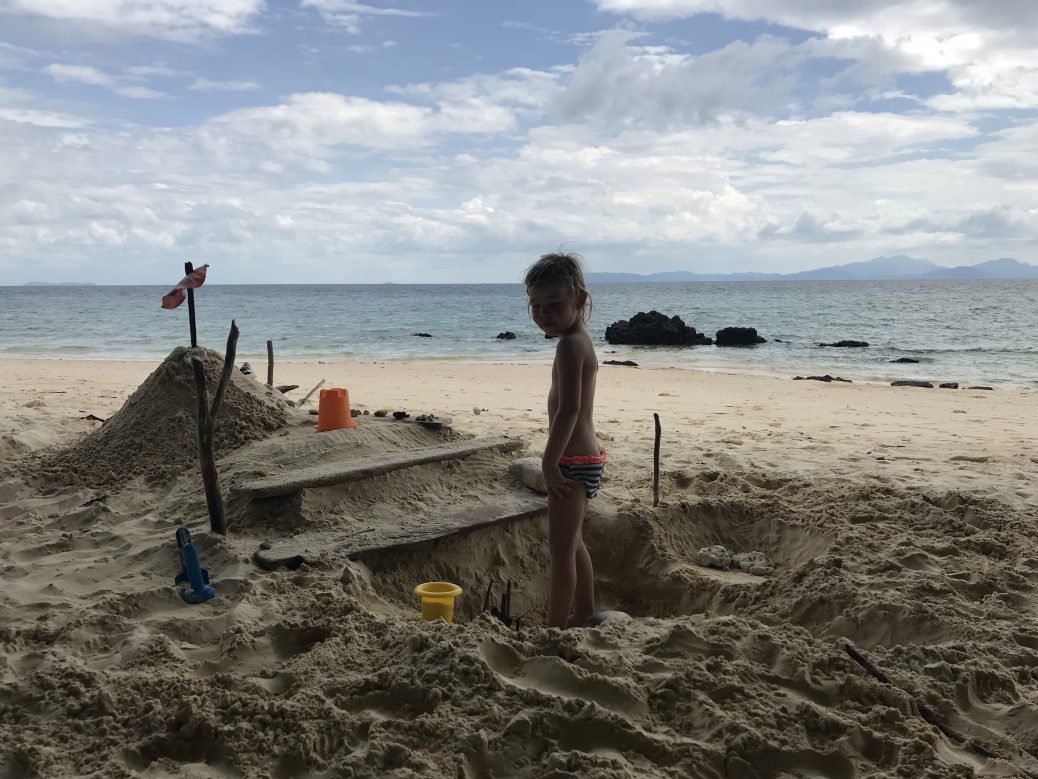 Zu zweit wurde uns das Chillen am Strand früher ziemlich schnell fad und es zog uns meist zügig weiter. Um dann – am nächsten Ziel – da zu sitzen und uns zu fragen, was genau uns geritten hatte, den paradiesischen Ort zu verlassen. Mit Ella und Pia hingegen genießen wir das Lotterleben in vollen Zügen. Ambitioniert werden Sandburgen gebaut, die täglich expandieren und zu Teilen dann wieder von Godzilla-Pia zerstört und Fantasie-Ella umfunktioniert werden. Ausgiebiges Baden, selbstverständlich mehrmals täglich und Schaukeln in der Hängematte unter den schattenspendenden Kasuarien dazwischen. Ja, unser Strandleben könnte härter sein. Zur Bereicherung kommen dann die tierischen Einwohner der Insel vorbei: die etwas platschig-tollpatschigen Nashornvögel, die mit lautem Getöse, großen Körpern und ihren riesigen Schnäbeln die Äste zum schwanken bringen, allerlei Echsen, Krebse, Fische und Katzen. Aber am beeindruckendsten auf jeden Fall sind die behäbigen Warane, die um die Mittagszeit träge über den Stand schleifen, wie auf Besuch aus der Urzeit.