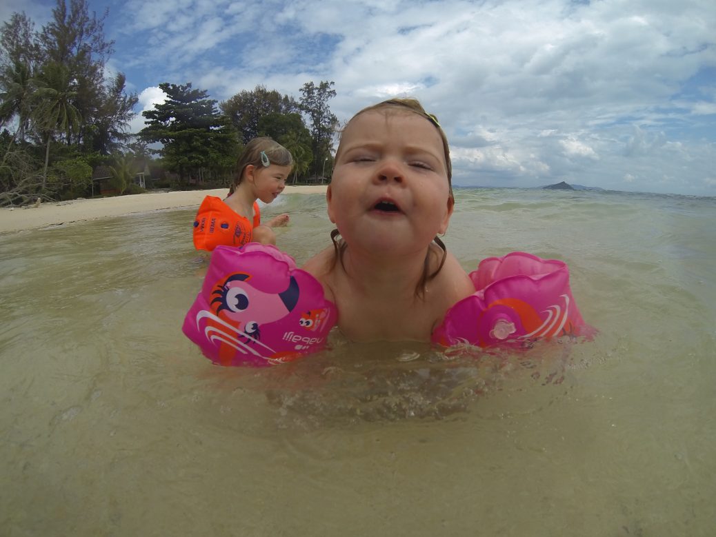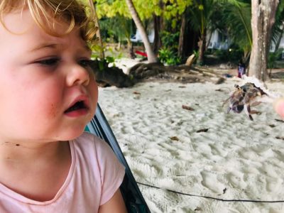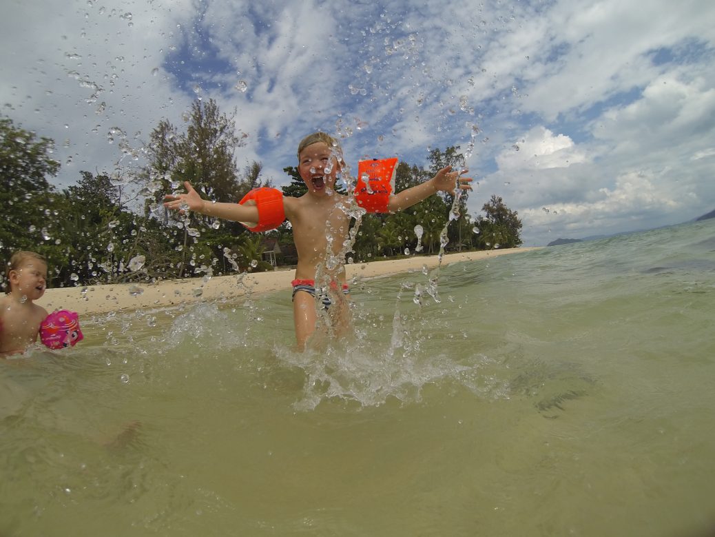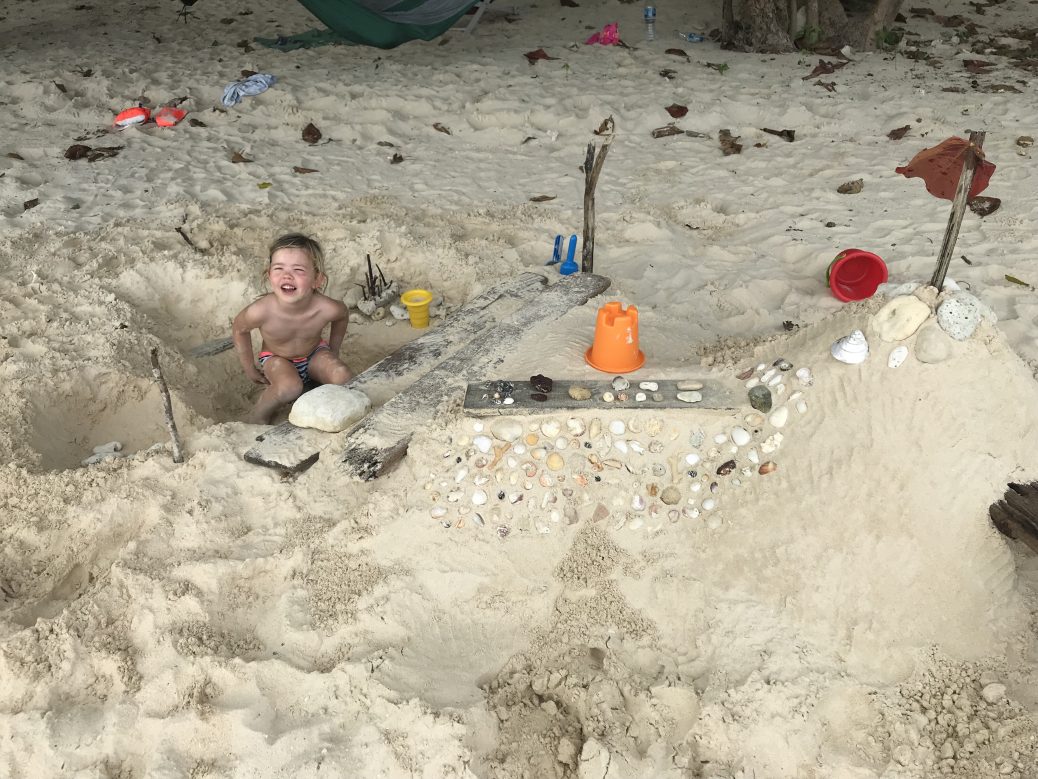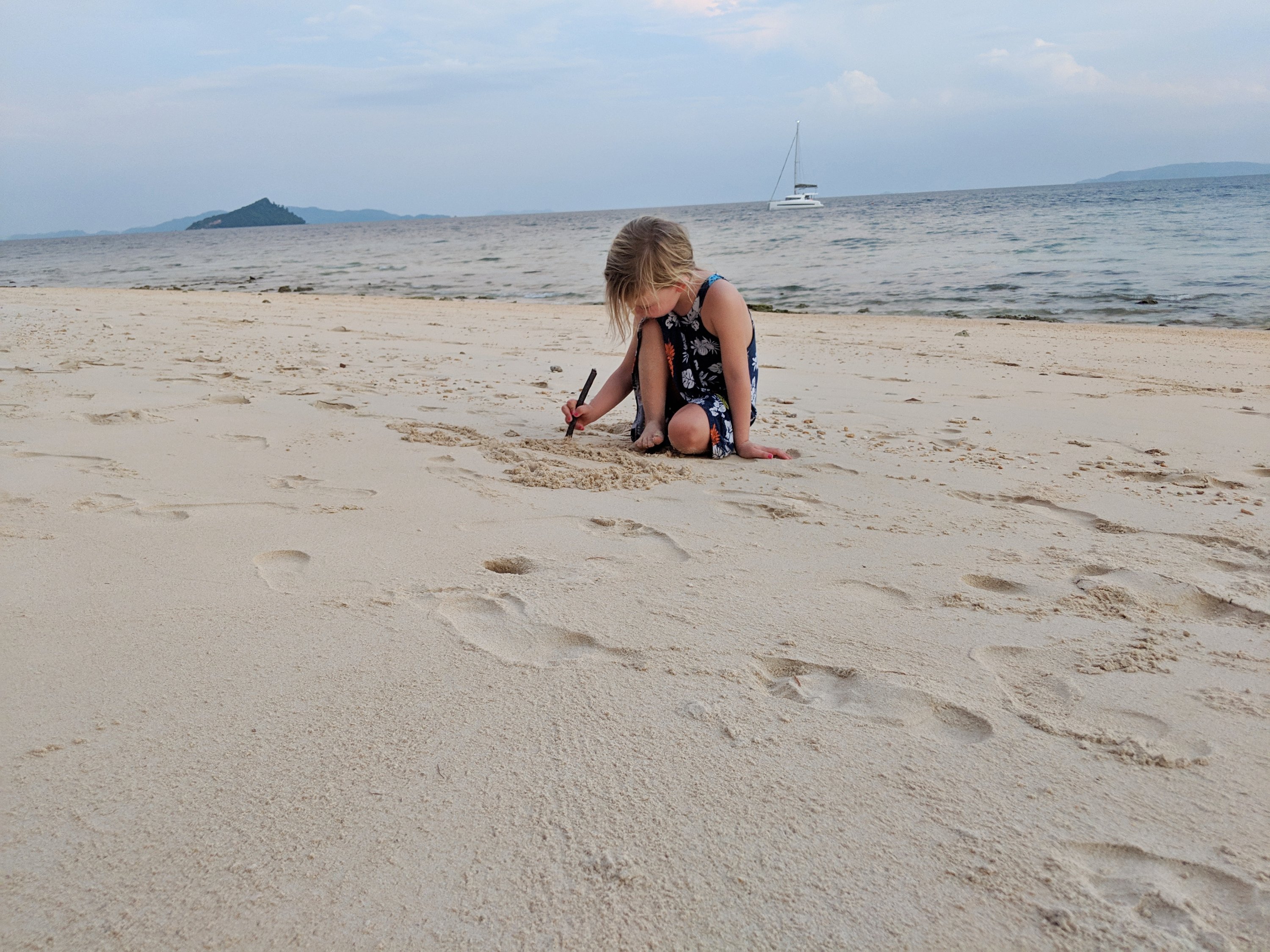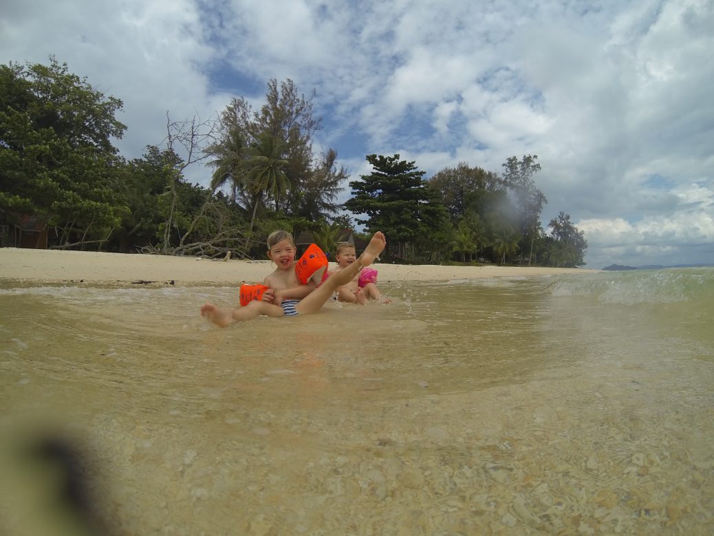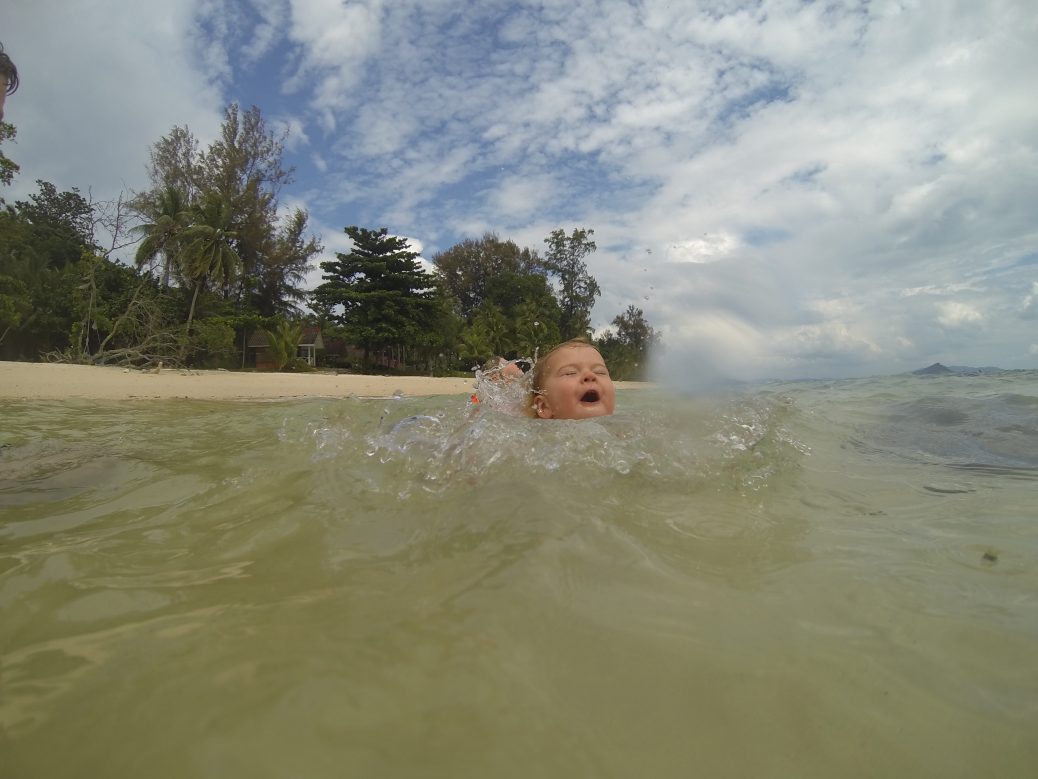 Zu zweit wurde uns das Chillen am Strand früher ziemlich schnell fad und es zog uns meist zügig weiter. Um dann – am nächsten Ziel – da zu sitzen und uns zu fragen, was genau uns geritten hatte, den paradiesischen Ort zu verlassen. Mit Ella und Pia hingegen genießen wir das Lotterleben in vollen Zügen. Ambitioniert werden Sandburgen gebaut, die täglich expandieren und zu Teilen dann wieder von Godzilla-Pia zerstört und Fantasie-Ella umfunktioniert werden. Ausgiebiges Baden, selbstverständlich mehrmals täglich und Schaukeln in der Hängematte unter den schattenspendenden Kasuarien dazwischen. Ja, unser Strandleben könnte härter sein. Zur Bereicherung kommen dann die tierischen Einwohner der Insel vorbei: die etwas platschig-tollpatschigen Nashornvögel, die mit lautem Getöse, großen Körpern und ihren riesigen Schnäbeln die Äste zum schwanken bringen, allerlei Echsen, Krebse, Fische und Katzen. Aber am beeindruckendsten auf jeden Fall sind die behäbigen Warane, die um die Mittagszeit träge über den Stand schleifen, wie auf Besuch aus der Urzeit.