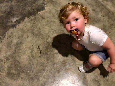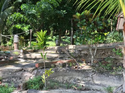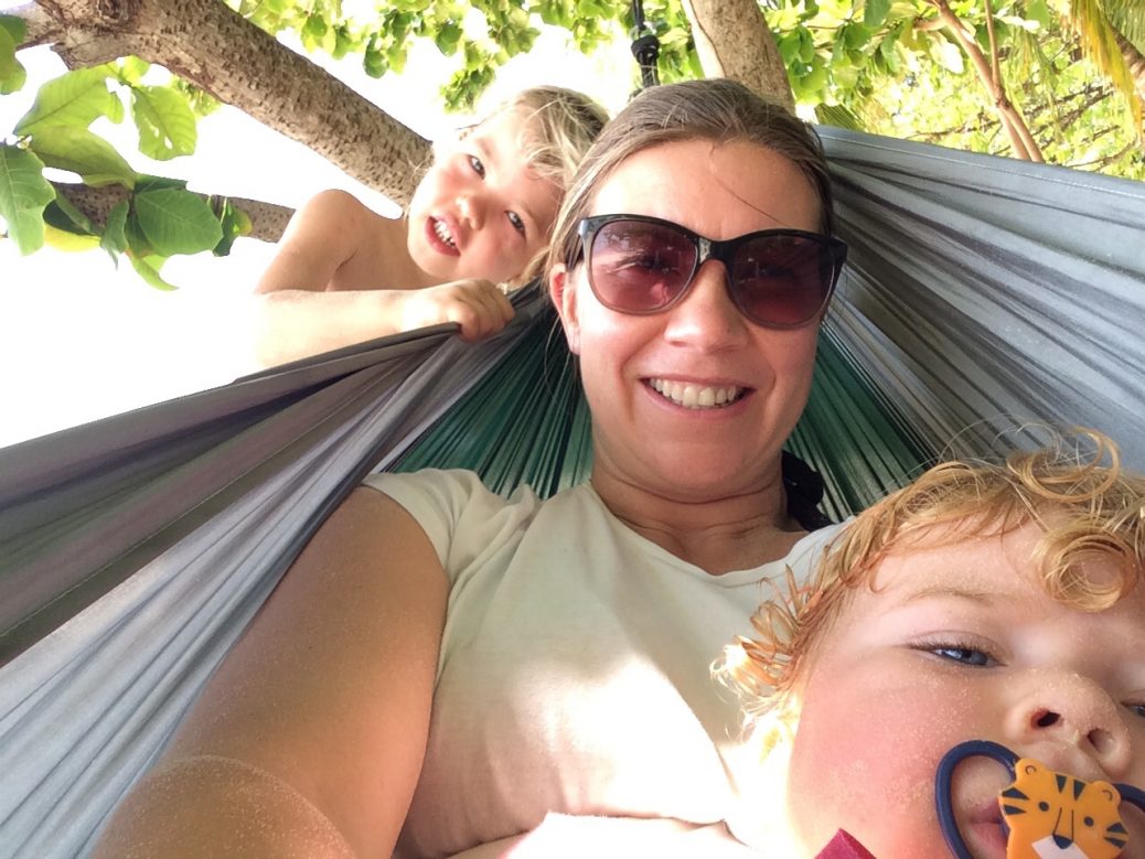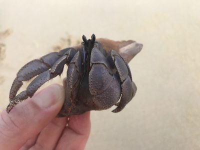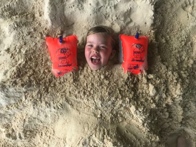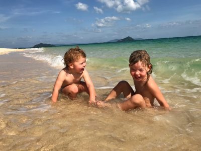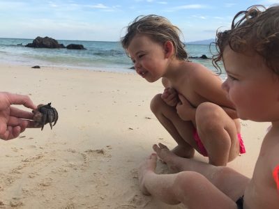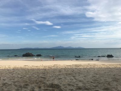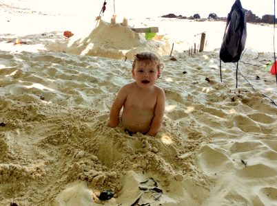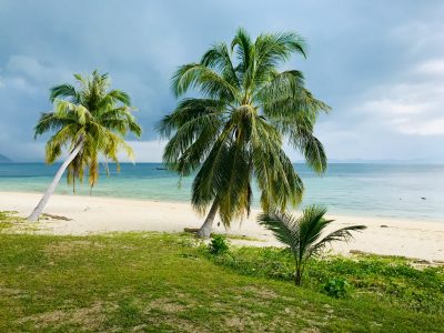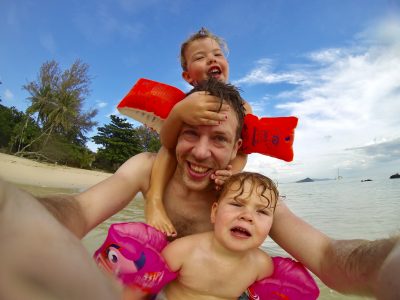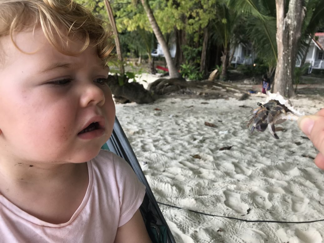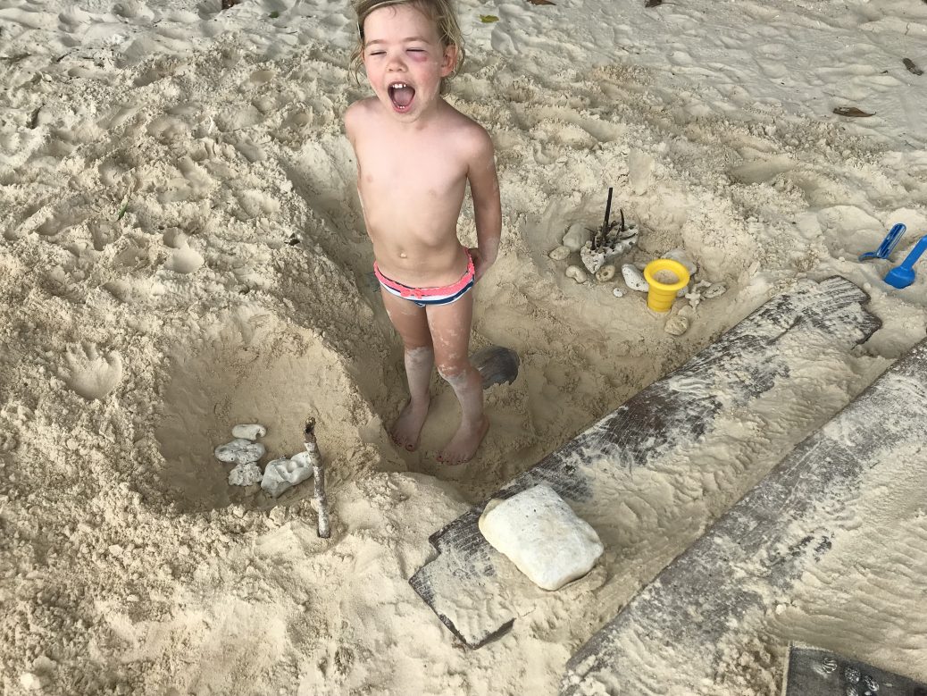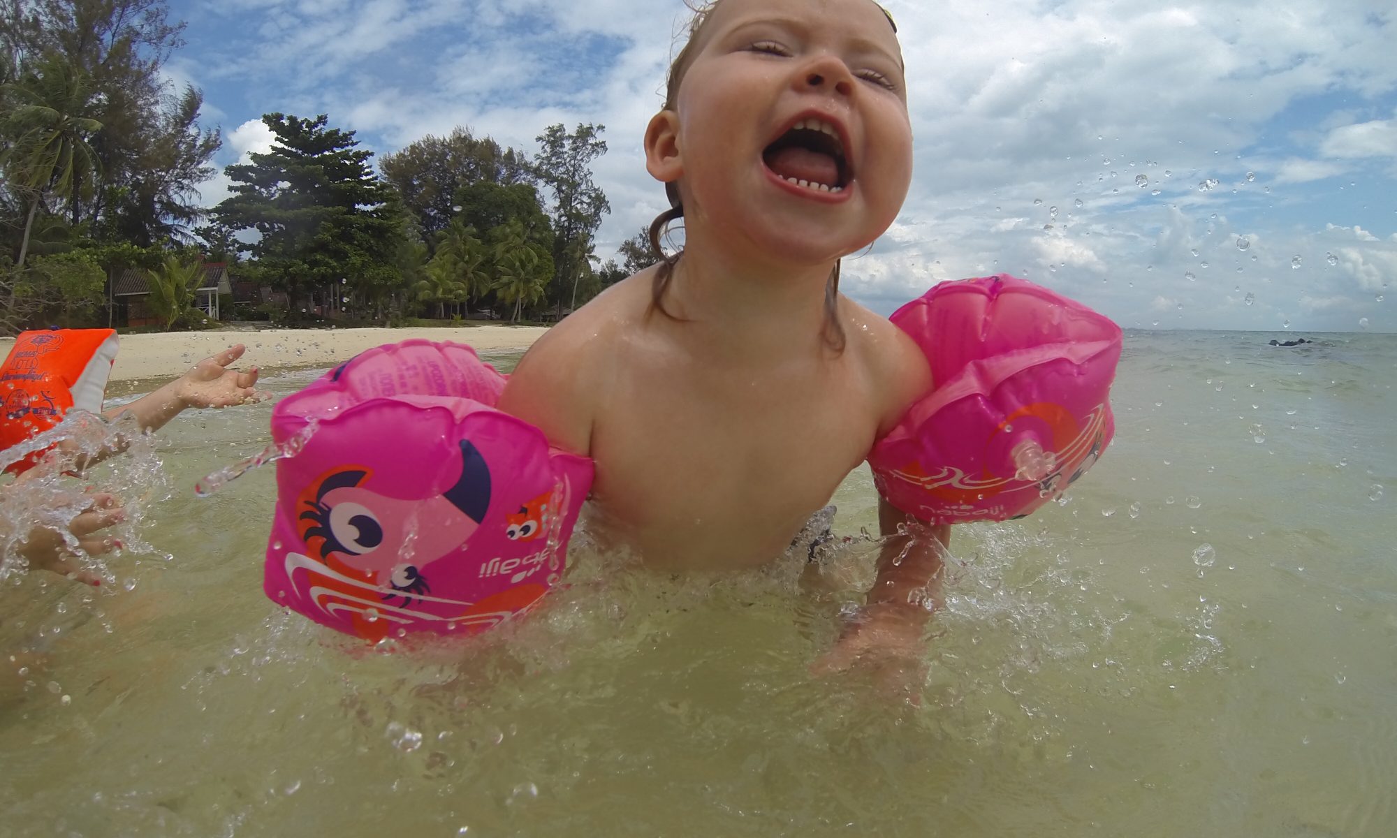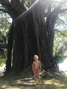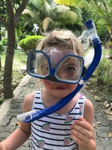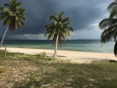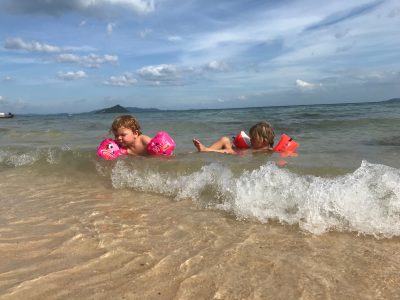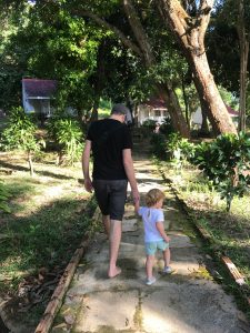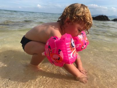 Zu zweit wurde uns das Chillen am Strand früher ziemlich schnell fad und es zog uns meist zügig weiter. Um dann – am nächsten Ziel – da zu sitzen und uns zu fragen, was genau uns geritten hatte, den paradiesischen Ort zu verlassen. Mit Ella und Pia hingegen genießen wir das Lotterleben in vollen Zügen. Ambitioniert werden Sandburgen gebaut, die täglich expandieren und zu Teilen dann wieder von Godzilla-Pia zerstört und Fantasie-Ella umfunktioniert werden. Ausgiebiges Baden, selbstverständlich mehrmals täglich und Schaukeln in der Hängematte unter den schattenspendenden Kasuarien dazwischen. Ja, unser Strandleben könnte härter sein. Zur Bereicherung kommen dann die tierischen Einwohner der Insel vorbei: die etwas platschig-tollpatschigen Nashornvögel, die mit lautem Getöse, großen Körpern und ihren riesigen Schnäbeln die Äste zum schwanken bringen, allerlei Echsen, Krebse, Fische und Katzen. Aber am beeindruckendsten auf jeden Fall sind die behäbigen Warane, die um die Mittagszeit träge über den Stand schleifen, wie auf Besuch aus der Urzeit.